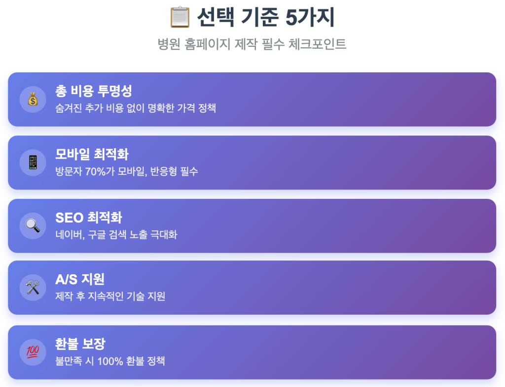 지금까지의 병원 홈페이지 제작업체 비교 내용을 바탕으로, 여러분의 상황에 맞는 선택 기준을 정리해드리겠습니다.